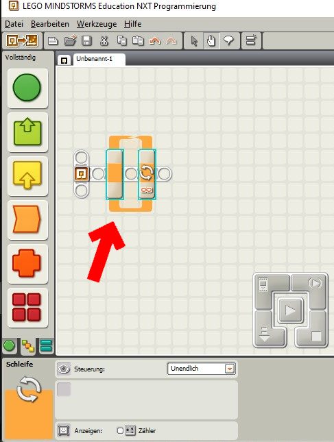 Platziere als erstes den "Wiederholen-Block" auf den Ablaufträger direkt neben dem Start-Sybol.